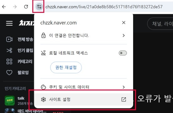 - 브라우저의 [설정 > 개인 정보 보호 및 보안 > 사이트 설정 > 추가 권한 > 로컬 네트워크 액세스]에 들어가서 chzzk.naver.com를 추가해주세요.