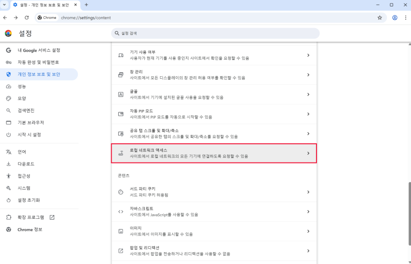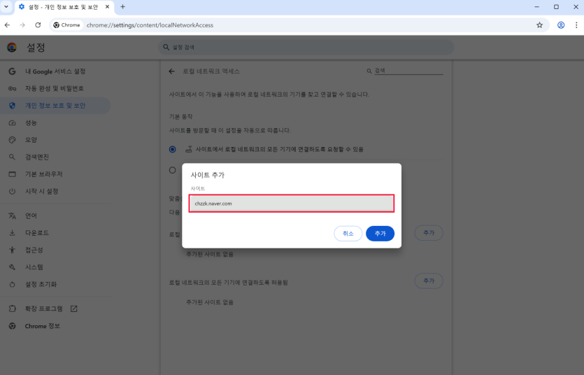 - 주소창 왼쪽 아이콘을 눌러 [사이트 설정 > 로컬 네트워크 액세스]를 허용하거나